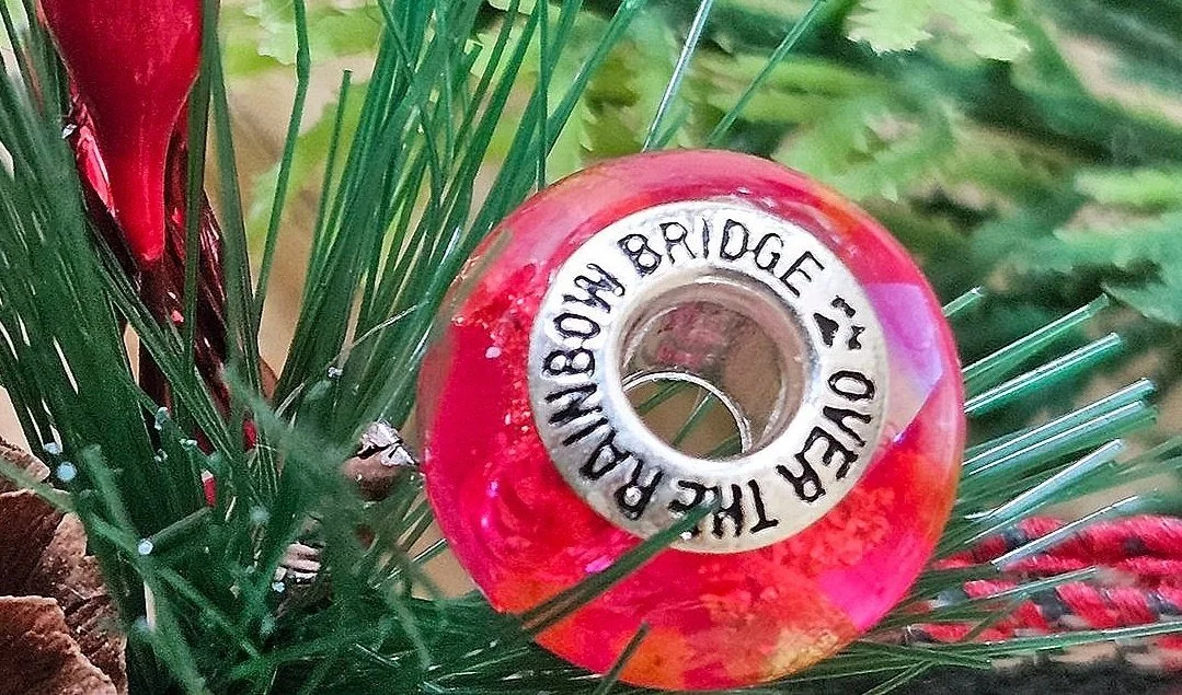 Perfect charm bead to contain your pet’s cremation ashes, hair or fur. The bead is custom made with your chosen colour and inclusions and mounted on a 925 solid sterling silver core. One end bears the words "Over the Rainbow Bridge". Compatible with most charm bracelets including Pandora™.